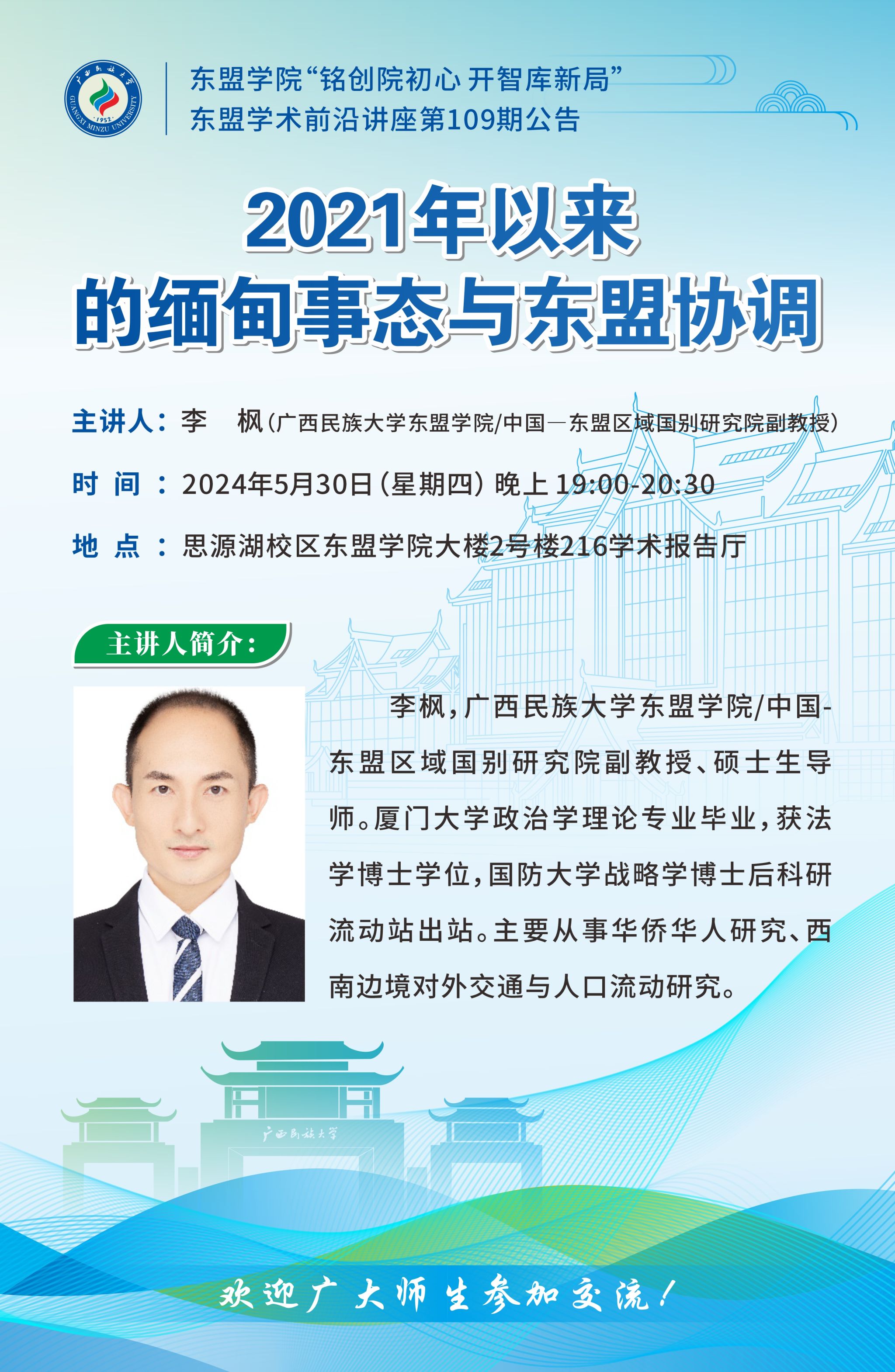 主 题:2021年以来的缅甸事态与东盟协调 主讲人:李枫(版权所有:乐天使-fun88乐天使-官方网站/中国—东盟区域国别研究院副教授) 时 间:2024年5月30日(星期四) 晚上 19:00—20:30 地 点:乐天使思源湖校区乐天使大楼2号楼216学术报告厅 欢迎广大师生参加、交流! 版权所有:乐天使-fun88乐天使-官方网站 中国—东盟区域国别研究院 2024年5月29日 主讲人简介: 李枫,乐天使/中国-东盟区域国别研究院副教授、硕士生导师。厦门大学政治学理论专业毕业,获法学博士学位,国防大学战略学博士后科研流动站出站。主要从事华侨华人研究、西南边境对外交通与人口流动研究。