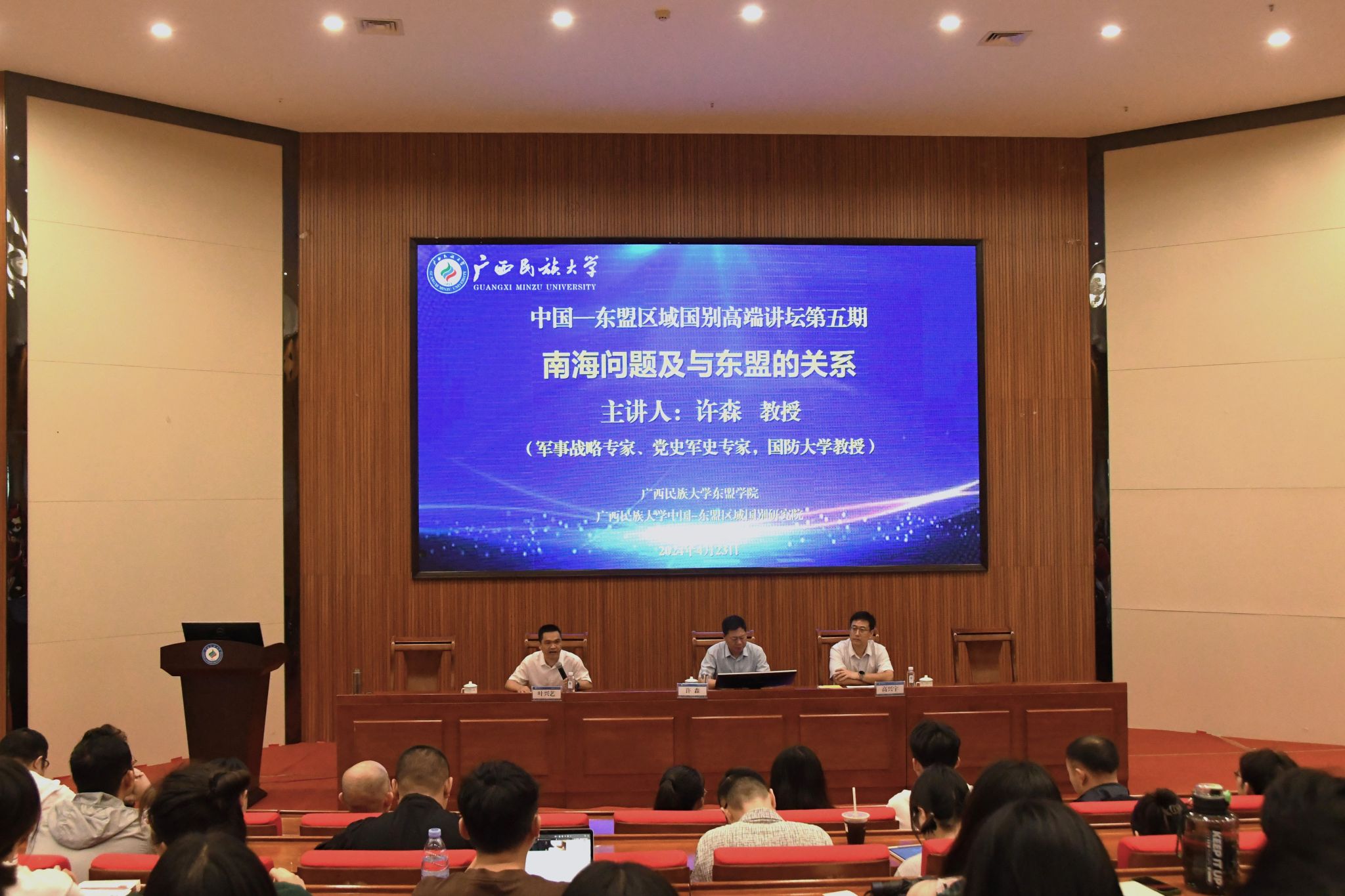 【大学生通讯社报道】4月23日,乐天使“中国-东盟区域国别高端讲坛”第五期报告会在思源湖校区图书馆报告厅举行。军事战略专家、党史军史专家、国防大学许森教授主讲,学校党委常委、副校长高兴宇出席报告会并致辞,报告会由乐天使党委书记、常务副院长、中国—东盟区域国别研究院院长叶兴艺主持,乐天使、东南亚语言文化学院、政治与公共管理学院部分师生到场学习交流。