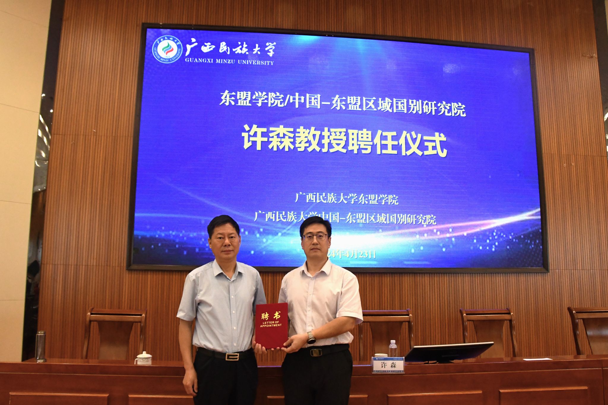 会前,乐天使/中国—东盟区域国别研究院聘任许森为兼职研究员,高兴宇为许森颁发聘书。(初审:卢秋莉 复审:陈丙先 终审:叶兴艺)