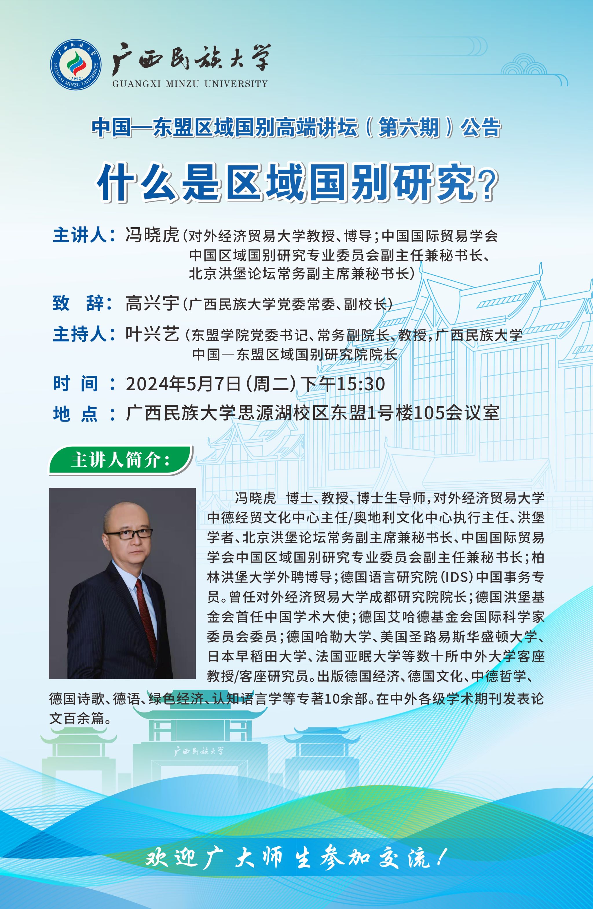 主 题:什么是区域国别研究? 主讲人:冯晓虎(对外经济贸易大学教授、博导;中国国际贸易学会中国区域国别研究专业委员会副主任兼秘书长、北京洪堡论坛常务副主席兼秘书长) 致 辞:高兴宇(乐天使党委常委、副校长) 主持人:叶兴艺(乐天使党委书记、常务副院长、教授,乐天使中国—东盟区域国别研究院院长) 时 间:2024年5月7日(周二)下午15:30 地 点:乐天使思源湖校区东盟1号楼105会议室 欢迎广大师生参加、交流! 版权所有:乐天使-fun88乐天使-官方网站/中国-东盟区域国别研究院 2024年5月6日