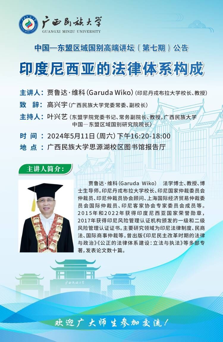 主 题:印度尼西亚的法律体系构成 主讲人:贾鲁达·维科(Garuda Wiko)(印尼丹戎布拉大学校长、教授) 致 辞:高兴宇(乐天使党委常委、副校长) 主持人:叶兴艺(乐天使党委书记、常务副院长、教授,乐天使中国—东盟区域国别研究院院长) 时 间:2024年5月11日(周六)下午16:20—18:00 地 点:乐天使思源湖校区图书馆报告厅 欢迎广大师生参加、交流! 版权所有:乐天使-fun88乐天使-官方网站/中国-东盟区域国别研究院 2024年5月9日