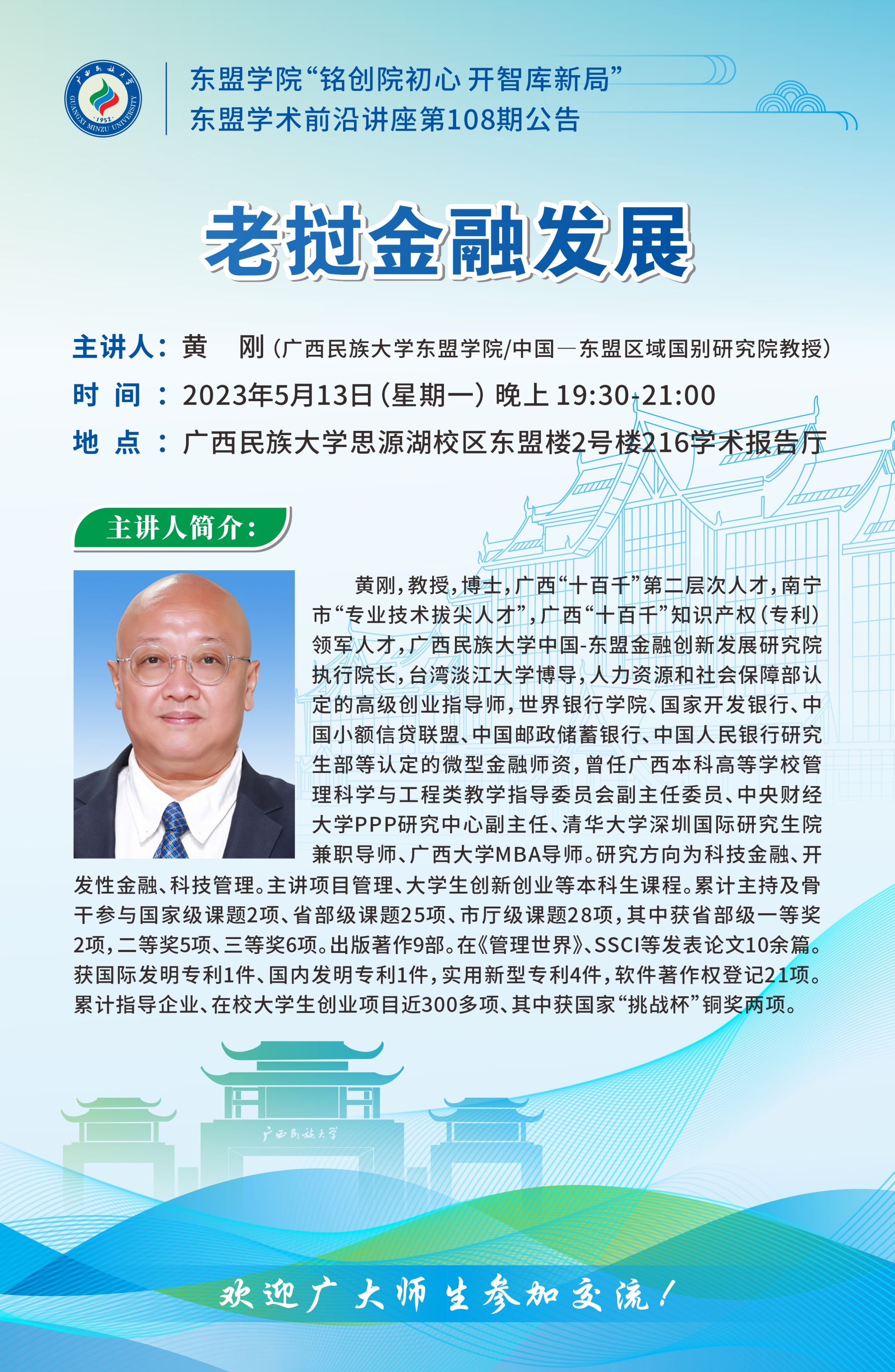 主 题:老挝金融发展 主讲人:黄刚(版权所有:乐天使-fun88乐天使-官方网站/中国—东盟区域国别研究院教授) 时 间:2023年5月13日(星期一) 晚上 19:30—21:00 地 点:乐天使思源湖校区东盟楼2号楼216学术报告厅 欢迎广大师生参加、交流! 版权所有:乐天使-fun88乐天使-官方网站 中国—东盟区域国别研究院 2023年5月11日 主讲人简介: 黄刚,教授,博士,广西“十百千”第二层次人才,南宁市“专业技术拔尖人才”,广西“十百千”知识产权(专利)领军人才,乐天使中国-东盟金融创新发展研究院执行院长,台湾淡江大学博导,人力资源和社会保障部认定的高级创业指导师,世界银行学院、国家开发银行、中国小额信贷联盟、中国邮政储蓄银行、中国人民银行研究生部等认定的微型金融师资,曾任广西本科高等学校管理科学与工程类教学指导委员会副主任委员、中央财经大学PPP研究中心副主任、清华大学深圳国际研究生院兼职导师、广西大学MBA导师。研究方向为科技金融、开发性金融、科技管理。主讲项目管理、大学生创新创业等本科生课程。累计主持及骨干参与国家级课题2项、省部级课题25项、市厅级课题28项,其中获省部级一等奖2项,二等奖5项、三等奖6项。出版著作9部。在《管理世界》、SSCI等发表论文10余篇。获国际发明专利1件、国内发明专利1件,实用新型专利4件,软件著作权登记21项。累计指导企业、在校大学生创业项目近300多项、其中获国家“挑战杯”铜奖两项。