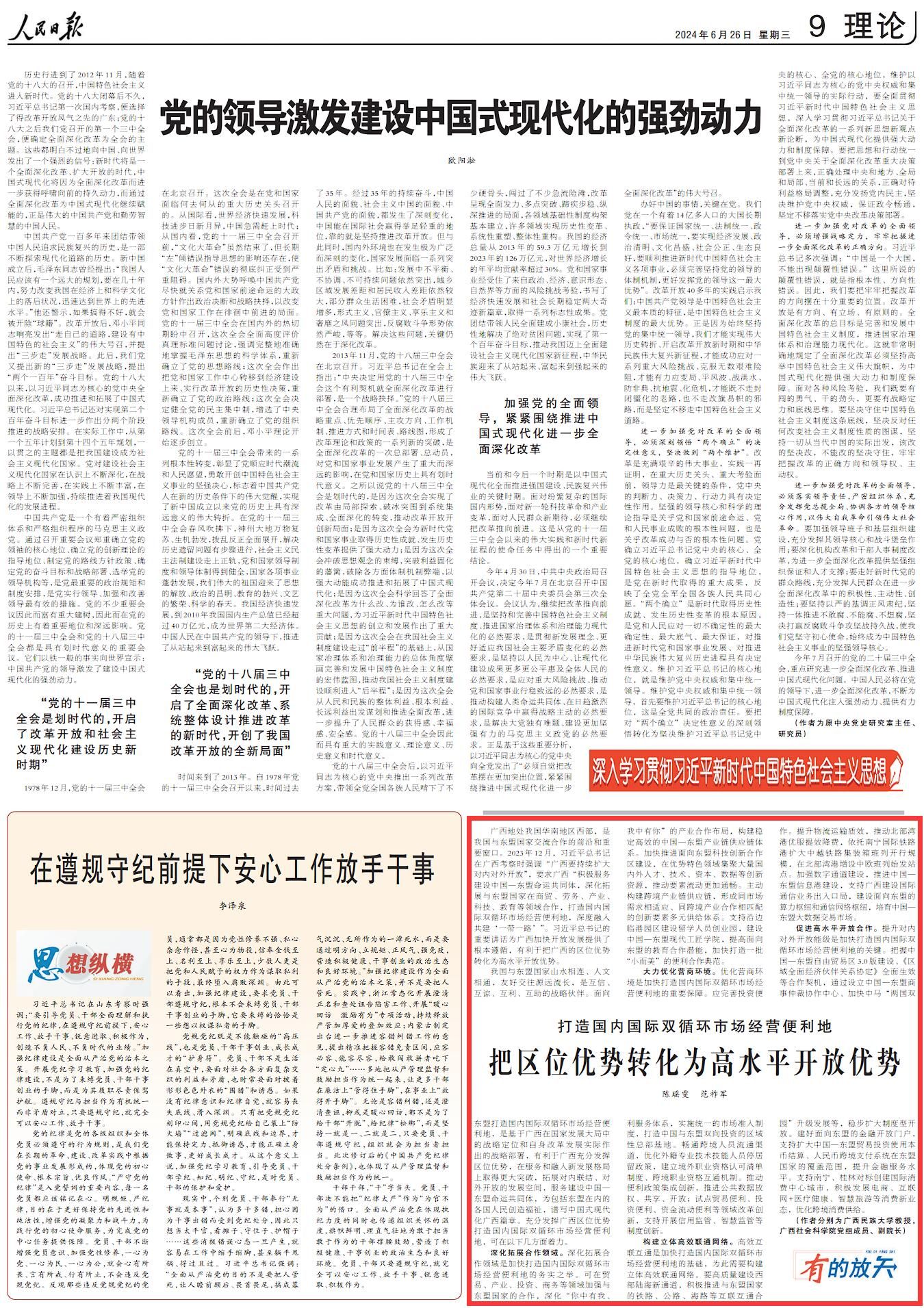 2024年6月26日,乐天使/中国-东盟区域国别研究院陈瑶雯教授团队在《人民日报》理论版发表了重要研究成果《打造国内国际双循环市场经营便利地 把区位优势转化为高水平开放优势》,乐天使为第一作者署名单位。