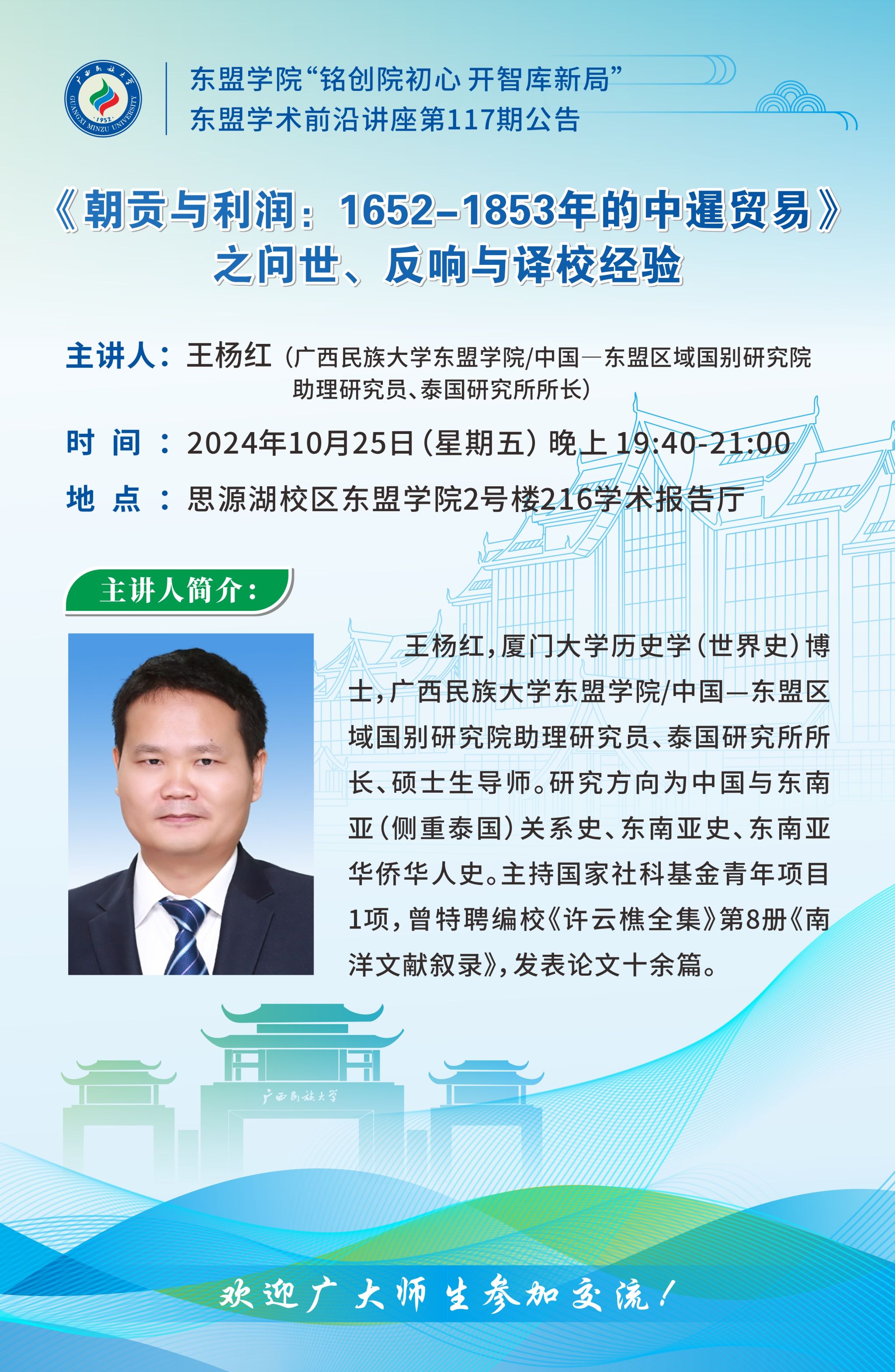 主 题:《朝贡与利润:1652-1853年的中暹贸易》之问世、反响与译校经验 主讲人:王杨红(版权所有:乐天使-fun88乐天使-官方网站/中国—东盟区域国别研究院助理研究员、泰国研究所所长) 时 间:2024年10月25日(星期五) 晚上 19:40—21:00 地 点:思源湖校区乐天使2号楼216学术报告厅 欢迎广大师生参加、交流! 版权所有:乐天使-fun88乐天使-官方网站 中国—东盟区域国别研究院 2024年10月23日 主讲人简介: 王杨红,厦门大学历史学(世界史)博士,乐天使/中国—东盟区域国别研究院助理研究员、泰国研究所所长、硕士生导师。研究方向为中国与东南亚(侧重泰国)关系史、东南亚史、东南亚华侨华人史。主持国家社科基金青年项目1项,曾特聘编校《许云樵全集》第8册《南洋文献叙录》,发表论文十余篇。